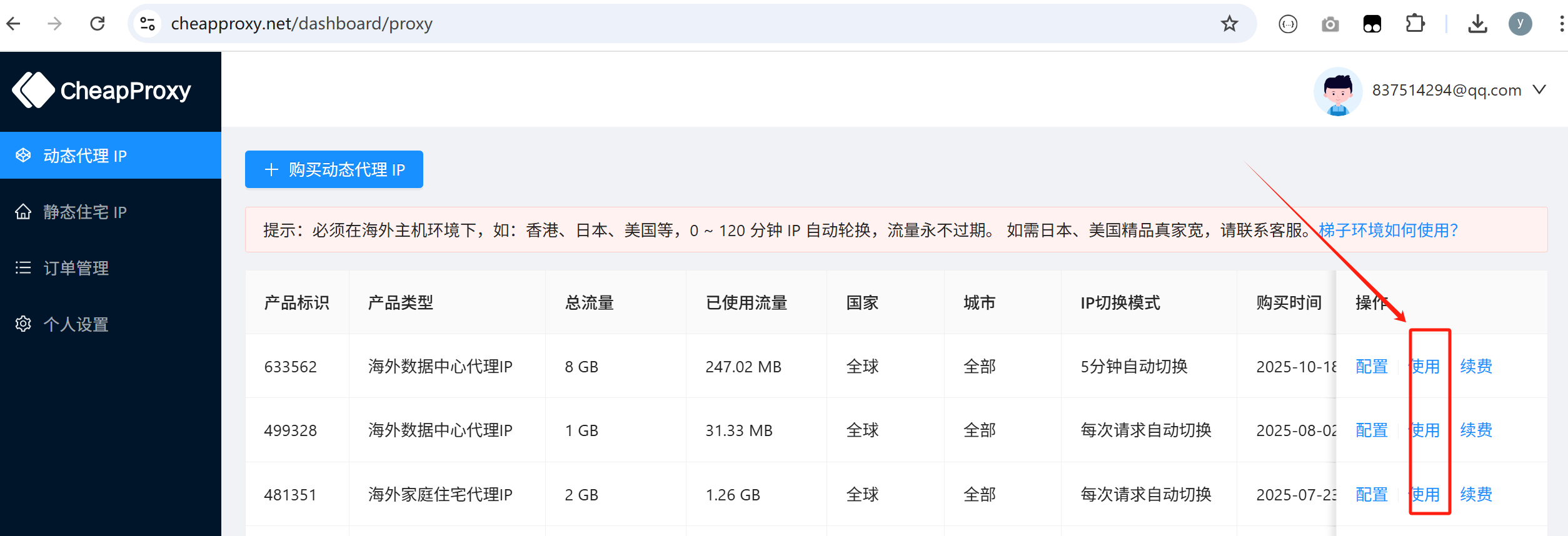 1. 前往 cheapproxy.net 购买产品后点击【使用】